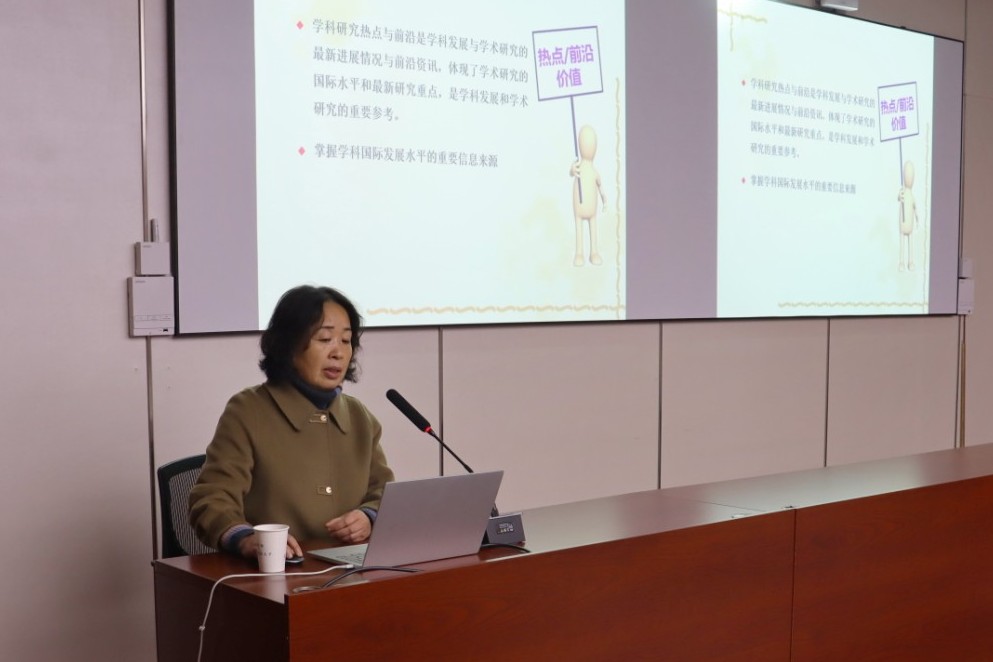 为落实二十大关于数字经济、科教强国、教育强国、网络强国的部署,坚持四个面向,服务国家战略,活动邀请了学校图书馆副研究馆员秦萍作了题为“追踪科研热点,助力科学研究”的信息素养培养专题报告,她从研究热点和研究前沿及其获取途径、利用Web of Science发掘学术热点、利用InCites平台挖掘热点和前沿三个方面进行了深入浅出地讲解。