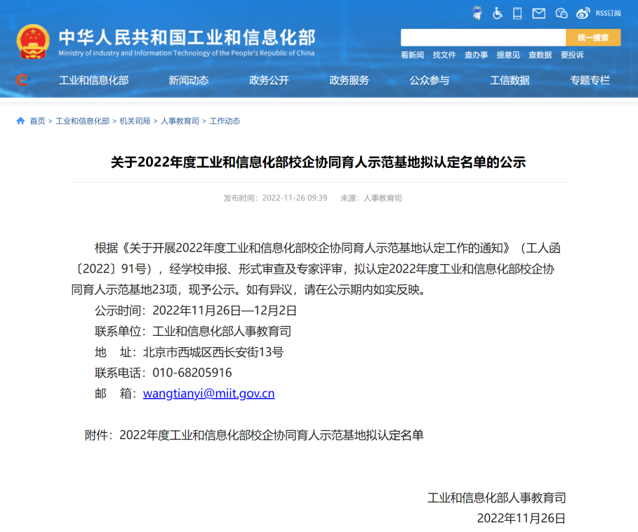 2022年11月26日,工业和信息化部人事教育司发布了《关于2022年度工业和信息化部校企协同育人示范基地拟认定名单的公示》通知。电子信息工程学院/集成电路学院申报的南京航空航天大学-中国航空工业无线电电子研究所航空电子协同育人基地成功入选2022年度工业和信息化部校企协同育人示范基地。