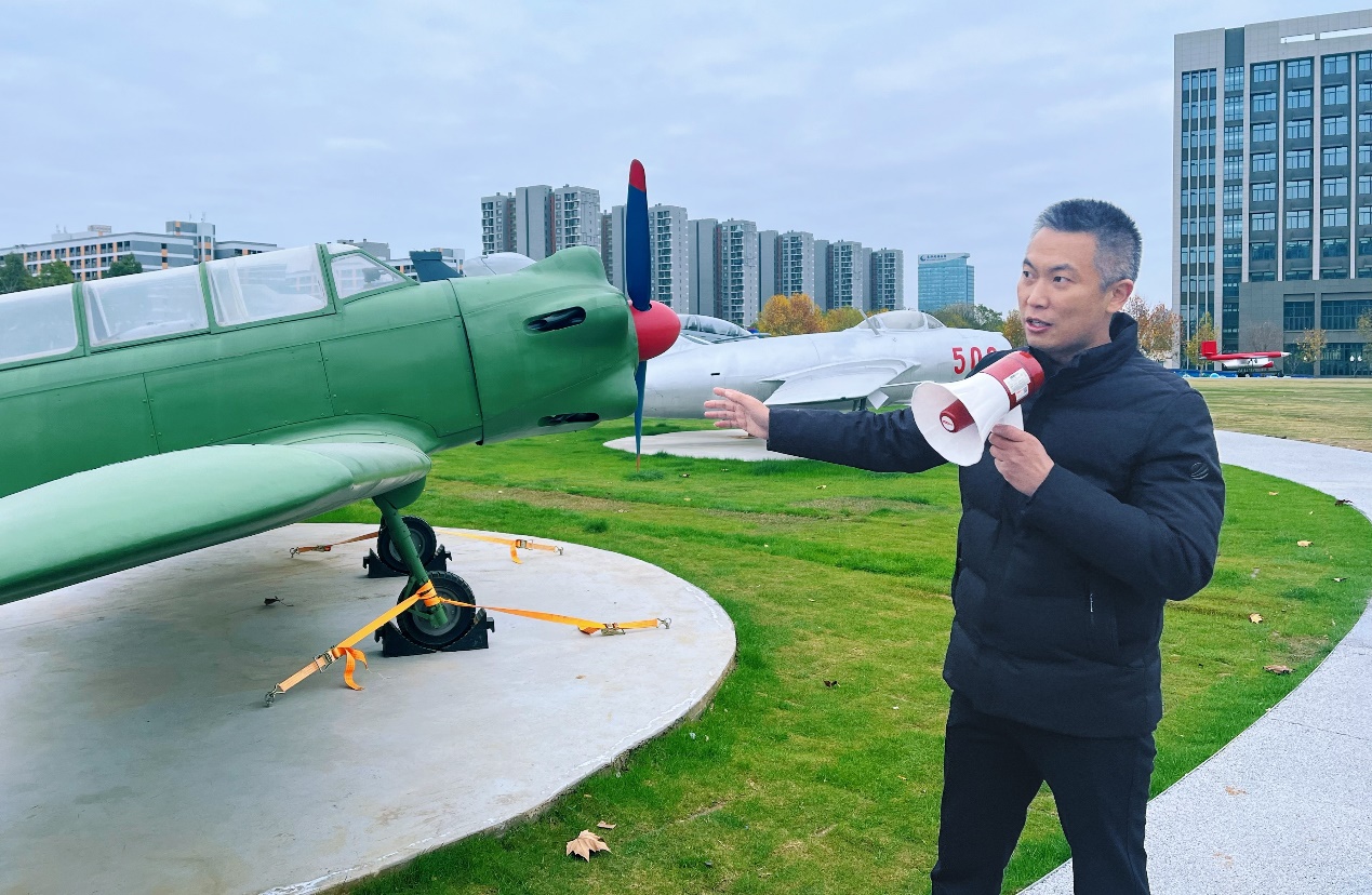 现场,基建处副处长周焱为两支部党员上了一堂题为《大国重器 御风而行》的沉浸式主题党课。他介绍了“御风园”的建设过程、功能分区以及作为国防教育和爱国主义教育平台的重要实践意义,同时结合时代背景、研发历程、历史意义等多个维度,对各类航空航天器的特点及背后故事进行了细致讲解,在场师生党员系统地了解了新中国自行生产的第一型飞机初教5、大型水陆两用飞机AG600静力试验机、我校研制的大型无人靶机长空一号等国家航空航天重器。场地内展出的19台航空航天器是我国航空航天工业筚路蓝缕、艰苦创业的奋斗缩影,彰显出南航人航空报国的红色基因、逐梦九天的蓝色梦想、勇于创新的实干精神。