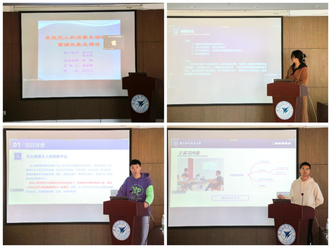 来自无人机研究院和南京长空科技有限公司的8位指导老师、来自我校能源与动力学院(线上)、自动化学院、机电学院和计算机科学与技术学院的4支学生实习团队的15名本科生参加答辩汇演。