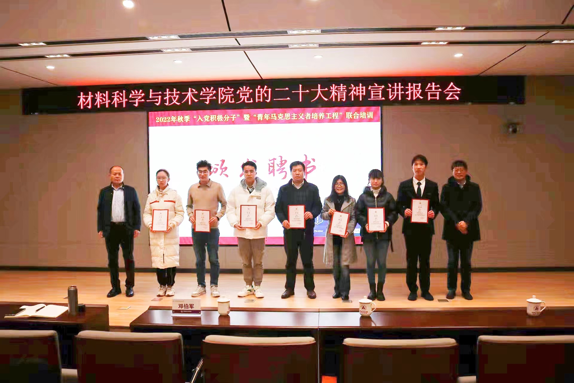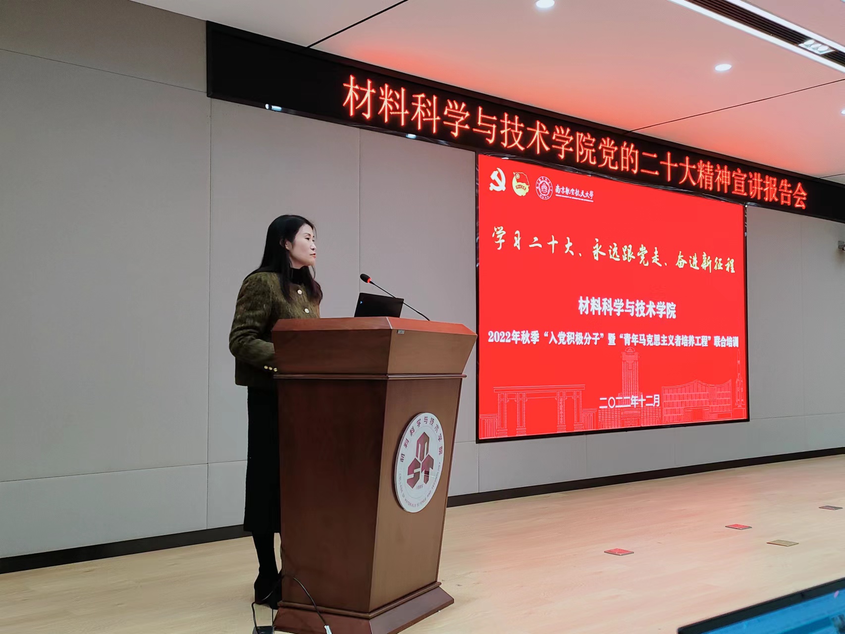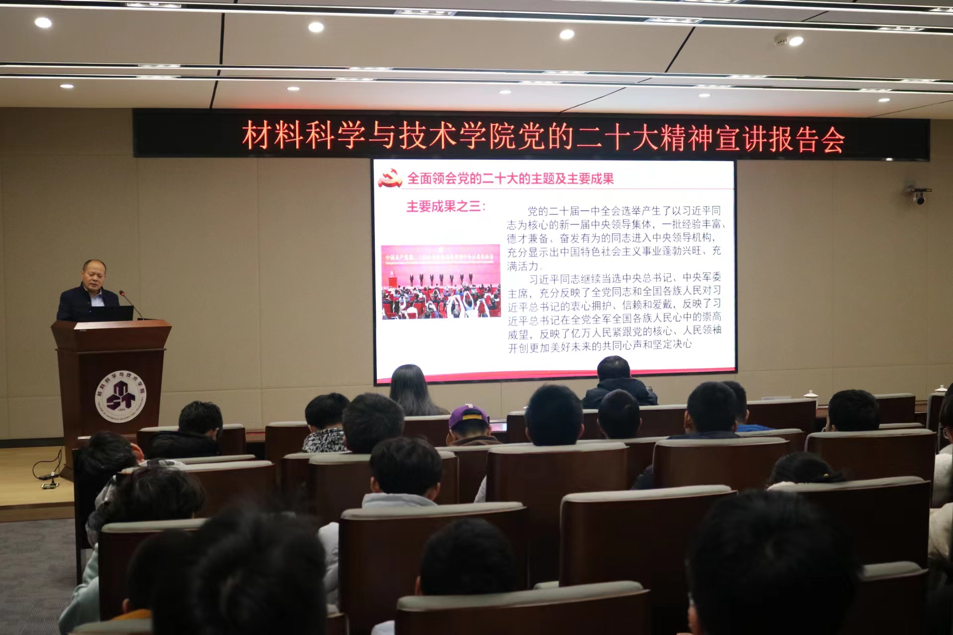 为深入学习贯彻党的二十大精神,12月7日,材料学院在将军路校区D10楼501报告厅举办党的二十大精神宣讲报告会。学校党的二十大精神宣讲团成员、马克思主义学院邓伯军教授应邀作报告。材料学院领导班子成员,教师党员、学生党员代表,入党积极分子180余人。报告会由材料学院党委副书记庄晓舒主持。