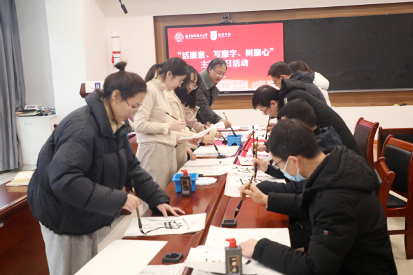 随后,活动邀请了学院胡冬生老师教大家书写“廉”字,在场师生在胡老师的指导下纷纷提笔写下“廉”字,一笔一画通过书法艺术将对崇廉尚洁的感悟理解融入笔锋,将廉洁之心书写于纸,并且围绕清廉主题,展开了热烈交流。