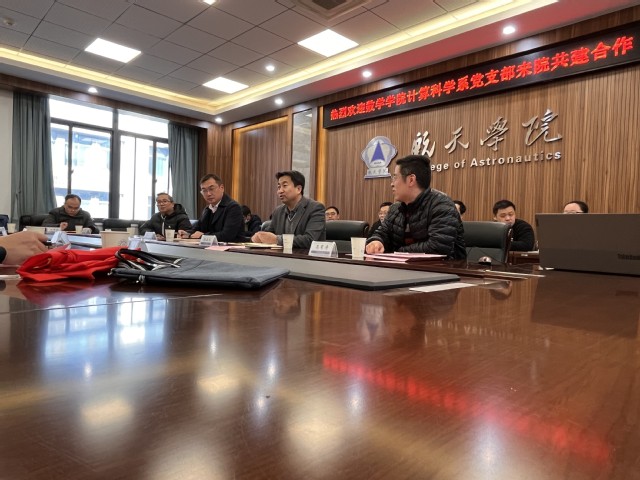 航天学院党委书记孙占久对数学学院一行的到来表示欢迎,他详细介绍了航天学院的发展历程、教学科研和人才培养情况,肯定了本次航天学院航天控制工程系党支部与数学学院计算科学系党支部开展结对共建活动的意义,并表示对双方党支部共建后的未来合作充满期待。随后双方党支部在专业特色、研究方向和合作领域展开了深入交流与广泛探讨。