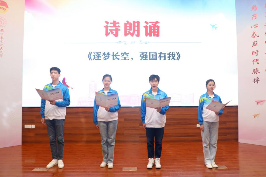 最后,江来、章子煜、谢婷月、靳恺月等四位同学带来诗朗诵《逐梦长空,强国有我》,用掷地有声的誓言为母校献出最真挚的礼赞。
