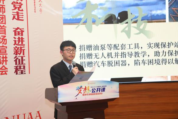 江苏高校团干部思政技能大比武基层团支部书记专项赛特等奖获得者、航空学院芦悦煊,全国五四红旗团支部驭风排气系统纵向团支部书记、能源与动力学院潘睿丰分别围绕“十年砥砺奋进,绘写壮美画卷”“科技自立自强,勇当青年先锋”的主题进行了示范宣讲。