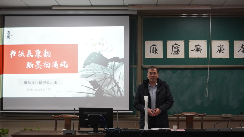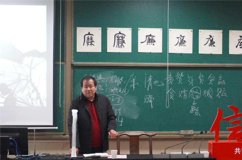 首先,张丕宏结合工作岗位和个人经历,围绕“遵纪守法、廉洁奉公”的主题,从中华传统文化中的“廉”出发,对“廉”的含义进行讲解。张丕宏强调,一是推动廉洁文化建设事关人人,无论是教师还是学生,都应将廉洁意识铭记于心;二是体悟廉洁要懂得自我约束,争做一个正直的人;三是要学法知法懂法用法,提高法律意识、加强法制修养,当好营造廉政建设良好氛围的生力军。