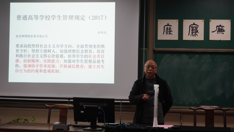 接着,马道全结合自身分管研究生教学工作的经历,围绕学术诚信讲解廉洁文化,带领大家进一步学习了解校园规章制度以及最新政策文件,指出要狠抓落实法律法规,务求实效,坚守学术诚信。鼓励青年大学生将诚信贯穿于学习、生活和实践过程中,让诚信成为我们日常生活中的自觉行为,坚持走正道,就能为全社会的廉洁文化建设做出自己的贡献