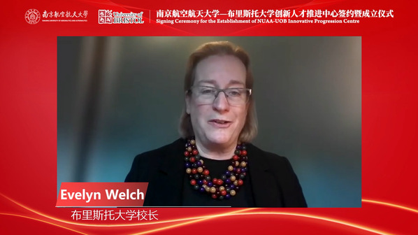 伊芙琳·韦尔奇表示,南航与布大合作密切,渊源深厚,面临疫情挑战,双方付出大量心血克服万难,推动南航—布大创新人才推进中心的成立,这是两校合作历程中具有里程碑意义的大事件。双方持续深化的合作伙伴关系将不仅成为联通布里斯托和南京的纽带,更将成为联通英国和中国的桥梁。她热忱欢迎南航学子加入中心学习,并希望双方共同致力于创新人才推进中心的发展,培养国际化创新型人才,进而促进两校取得更为丰硕的合作成果。
