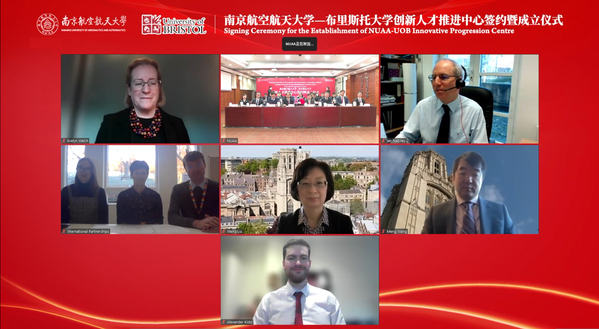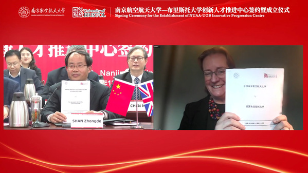12月8日下午,南京航空航天大学—布里斯托大学创新人才推进中心签约暨成立仪式在明故宫校区举行。我校校长单忠德院士,副校长施大宁、姜斌,研究生院、教务处、学生处、国际合作处、各相关学院领导代表中方出席仪式。布里斯托大学校长伊芙琳·韦尔奇,国际部、计算机科学、电气电子工程和工程数学学院及国际合作伙伴关系处相关领导代表英方出席仪式。