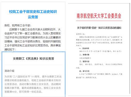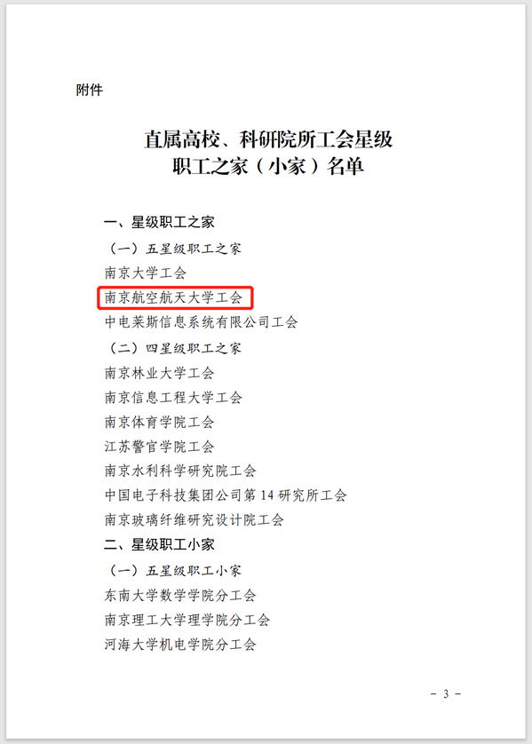 发挥先进典型作用。积极培育、选树、宣传先进典型,充分发挥先进典型的引领示范作用,开展“劳模精神进校园”活动,组织、协调“全国劳模报告会”等活动近20场;开展首届“南航巾帼十杰”荣誉评选。五年来,多个集体和个人荣获“全国巾帼文明岗”“江苏省工人先锋号”“全国五一劳动奖章”“江苏省五一劳动奖章”“江苏省三八红旗手”等称号。