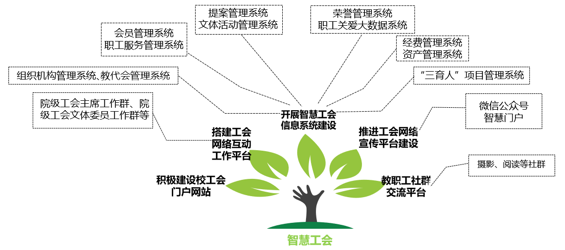 加强网上工会建设。积极推进“网上工会”建设,推进工会工作信息化、智能化。更新门户网站、优化电子提案系统、实现工会经费报销网银化、建立智慧工会信息平台等,把工会工作的“根据地”拓展到网络,打造网上网下相互促进、有机融合的工会工作新格局,努力为教职工提供更暖心、更贴心的服务。