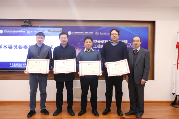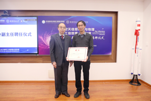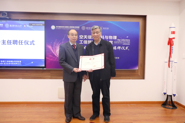 在聘任暨揭牌仪式环节,祝世宁、顾冬冬、陈修文、刘友文共同为“空天信息材料与物理”工信部重点实验室揭牌;刘友文介绍了学术委员会成员,并为线下参会的重点实验室学术委员会主任祝世宁院士、副主任徐春祥教授、委员曾海波教授、朱孔军教授、邱雷教授、徐飞教授颁发聘书。
