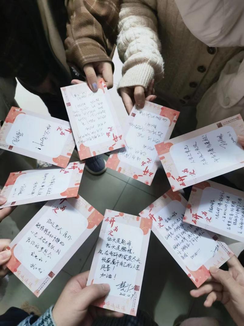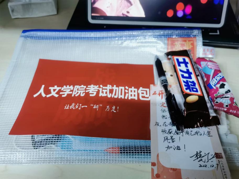随后,老师们为考研学子一一送上考研加油包。其中,棒棒糖寓意“‘棒’上有名;士力架寓意“能量满满”;暖宝宝寓意“研途暖暖”;祝福卡片承载着学院老师对同学们的真诚祝福,一“研”为定;其他物品也蕴含了学院全体领导和老师对同学们美好期待与温馨鼓励。