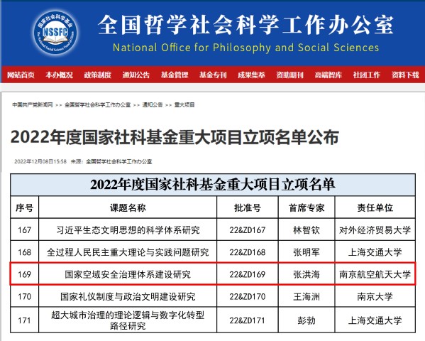 近日,全国哲学社会科学工作办公室正式公布了2022年度国家社科基金重大项目立项名单。我校通用航空与飞行学院张洪海教授领衔申报的《国家空域安全治理体系建设研究》成功中标,获批立项。这是我校历史上第11项、近三年第7项国家社科基金重大项目,也是首个由工科学院教授申报并立项的国家社科基金重大项目。