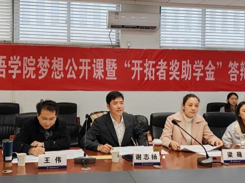 为激励外国语学院学生注重团队合作、积极进取、勇于担当、全面发展、成长成才,并资助家庭经济困难学生,学院2010届杰出校友冯科茗、谢志扬、单鹤在外国语学院设立“开拓者奖助学金”,并于12月9日成功举办外国语学院梦想公开课暨“开拓者奖助学金”答辩。开拓者奖助学金资助人谢志扬,外国语学院党委副书记梁薇,英语系副主任王伟,学院团委书记李萍,本科生辅导员彭欢、赵瑜瑶担任评委。公开课由学院2019级英语专业、2021年茗扬开拓者奖学金获得者张欣怡主持,学院各年级同学通过腾讯会议线上观摩。