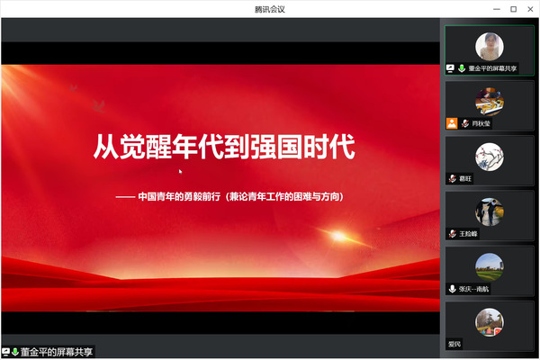 董金平以《从觉醒年代到强国时代——中国青年的勇毅前行(兼论青年工作的困难与方向)》为题,着重解读了二十大报告中关于青年的重要论述,从“不同时期青年的使命”、“青年生存与发展的环境发生变化”、“青年工作的困难与方向”分析了青年工作。作为青年工作者,应该给青年以信心,给青年以希望,给青年施展自己的舞台,做好青年的知心人、热心人和引路人。