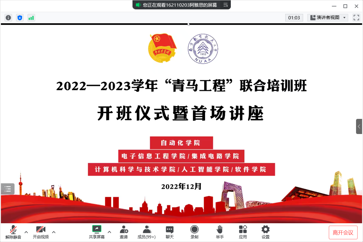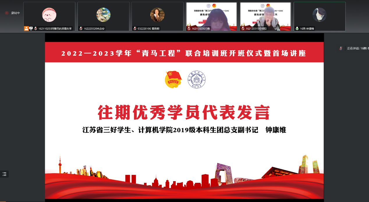 12月16日,自动化学院、电子信息工程学院/集成电路学院、计算机科学与技术学院/人工智能学院/软件学院通过“腾讯会议”在线举行2022—2023学年“青马工程”联合培训班开班仪式暨首场讲座。校团委副书记王洋、马克思主义学院副院长陈红桂、自动化学院党委副书记丁琛、电子信息工程学院党委副书记雷蕾、计算机科学与技术学院党委副书记王宁出席本次活动,三学院团委书记及本期青马班全体学员共同参加,活动由计算机学院团委副书记阿雅思主持。