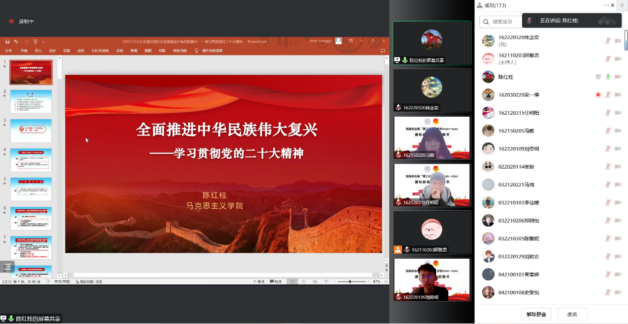 陈红桂作了题为《以中国式现代化全面推进中华民族伟大复兴——学习贯彻党的二十大精神》的首场专题讲座。讲座介绍了二十大及其主题、成果、结构等,阐释了中国式现代化理论,带领青马班学员深入学习贯彻党的二十大精神。陈老师号召青年朋友们,要始终坚定不移听党话、跟党走,将个人成长与中华民族伟大复兴的历史使命紧紧连在一起,立志投身强国伟业,在强国之路上勇毅前行,努力成长为堪当民族复兴重任的时代新人。