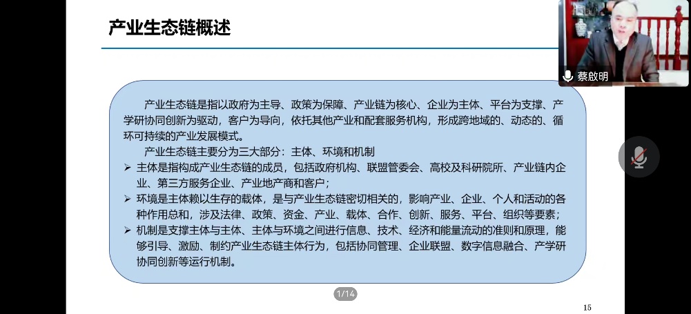 为深入贯彻落实党的二十大精神,12月20日,产业党工委邀请学校党的二十大精神宣讲团成员、经济与管理学院蔡啟明教授线上讲授党的二十大精神专题宣讲报告。报告的主题是“构建产业生态链,提升产业竞争力”。产业党工委领导班子成员、全体党员、预备党员、入党积极分子、职工代表和无人机研究院党委部分党员代表共一百余人参加了此次报告会。会议由党工委副书记刘双丽主持。
