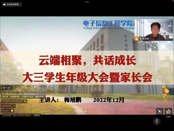 为了进一步引导学生提前做好学业规划,塑造学院优良学风,同时确保同学们安全、有序离校。12月13日,电子信息工程学院/集成电路学院召开“云端相聚,共话成长”2020级本科生主题年级大会暨家长会,由辅导员梅旭鹏主持。参加此次会议的还有学院兼职辅导员崔甜,2020级全体学生及学生家长。