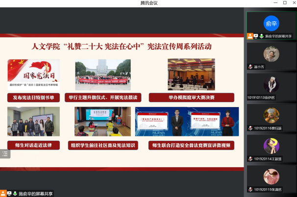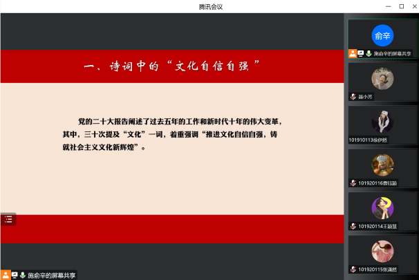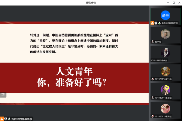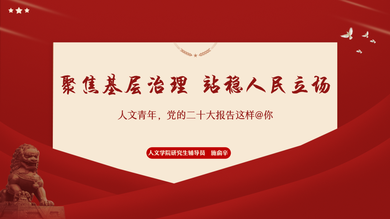 在青年的成长过程中,大学阶段属于价值观形成和确立的“拔节孕穗期”,通过加强对党的二十大报告的学习,鼓舞广大青年立鸿鹄志、做奋斗者,在当下具有深刻意义。12月16日,人文学院召开了“聚焦基层治理,站稳人民立场——人文青年,党的二十大报告这样@你”公开月讲评,辅导员施俞辛主讲,本研全体发展对象、入党积极分子线上参加。