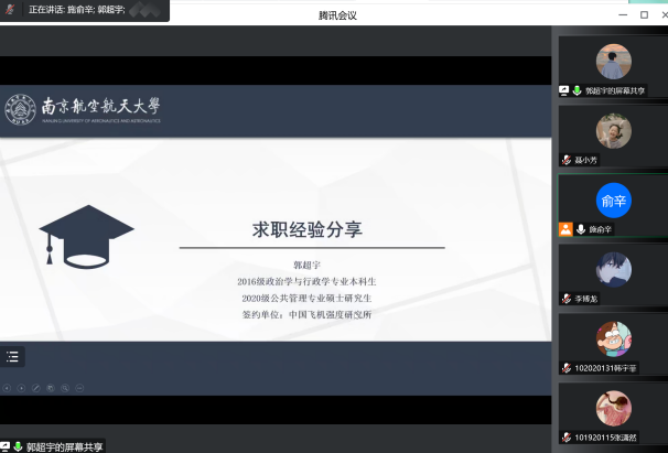 最后,学院本年度研究生国家奖学金获得者李博龙、已签约国防单位的就业先锋郭超宇,作为“朋辈导师”讲述了自己奋进研途和求职的故事。激励所有学生用青春的智慧和汗水打拼出一个更加美好的未来。