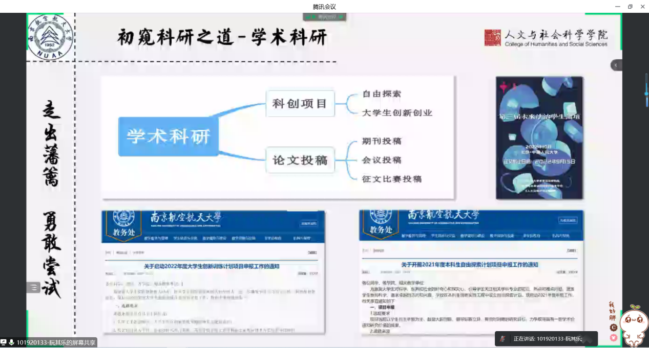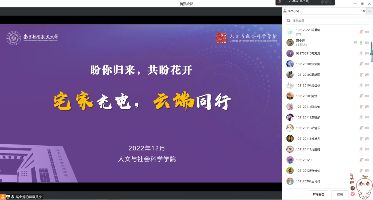 12月18日,人文学院召开了“宅家充电,云端同行”2021级本科生月讲评。此次会议由辅导员聂小芳主持,全体2021级本科生参加了会议。本次月讲评目的在于引导同学们科学认识疫情,调适自己的情绪,缓解心理压力,保持心理健康。