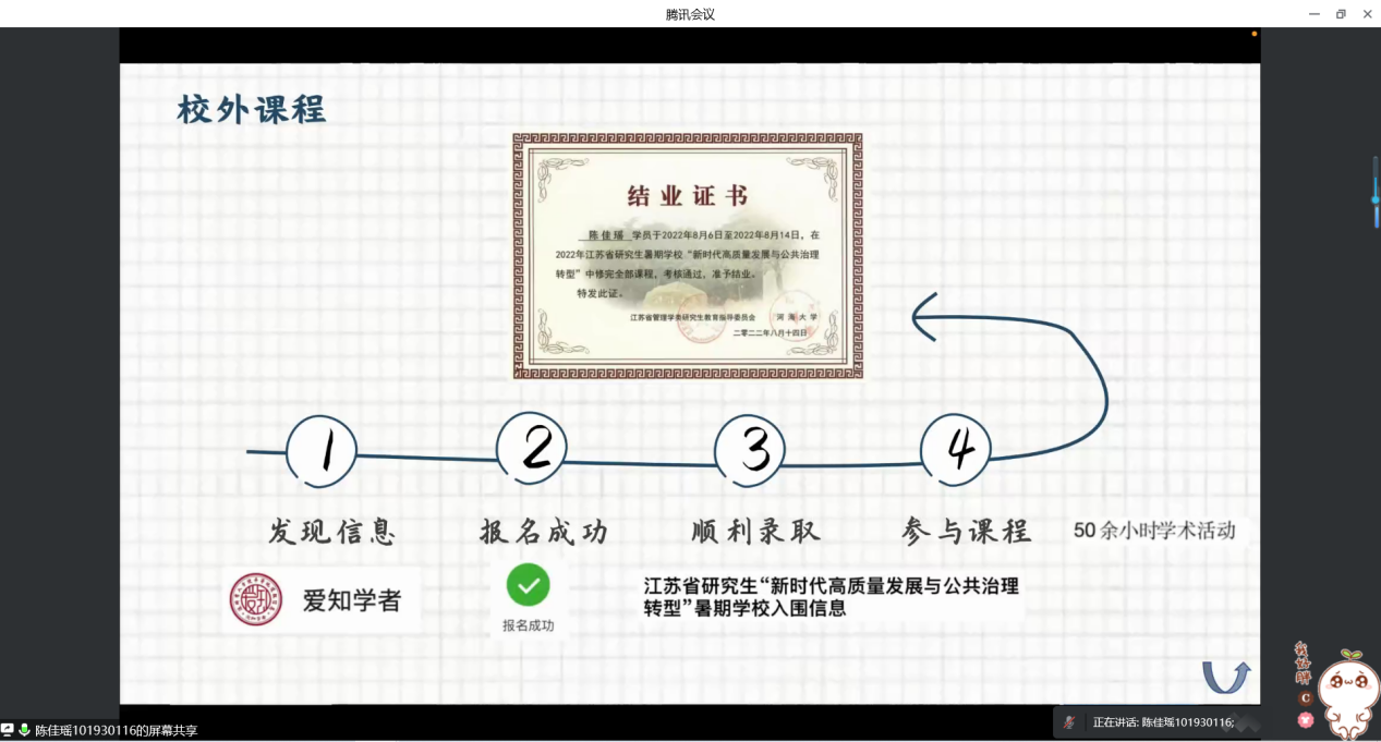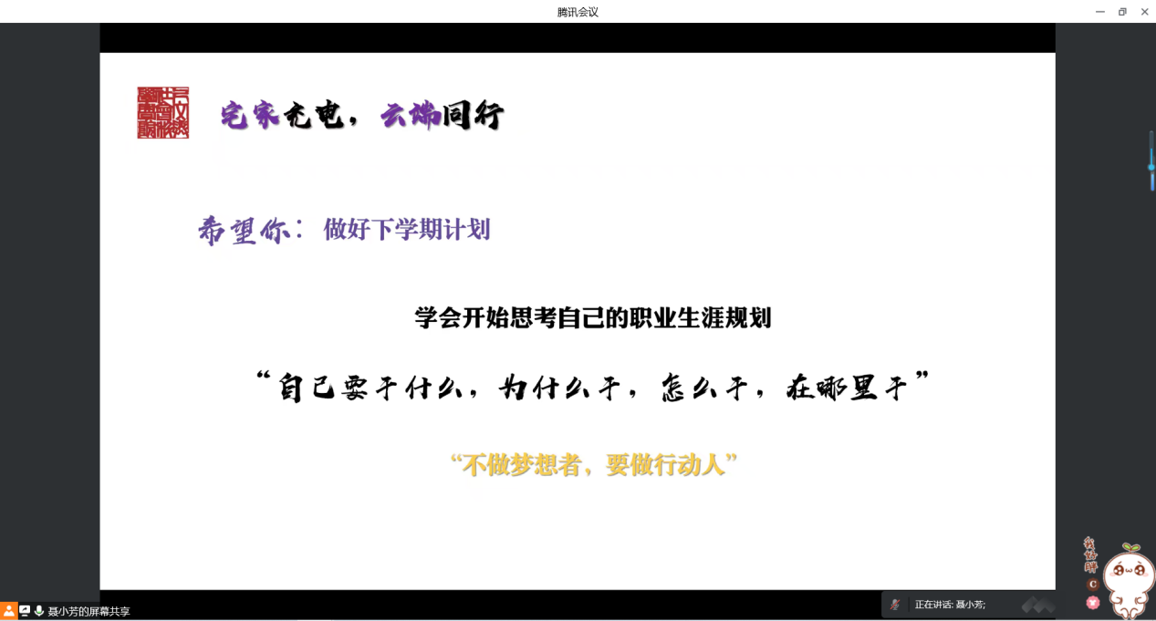 会上,聂小芳为大家分析了理性认识疫情与科学防护的必要性。在了解到部分同学对当下疫情情况的担心与焦虑后,聂小芳通过分享钟南山院士讲座内容为同学们提出了许多切实的建议。她鼓励大家要掌握科学的防护知识,理性认识疫情形势,在家也不能忘记“充电”,通过阅读、锻炼等方式让自己“忙起来”,并认真为下半学期做好规划。
