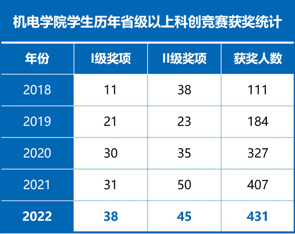 据统计,2022年度,机电学院学生累计获国家级科创奖项38项、省级奖项45项,省部级以上获奖人次超430人,位居全校前列!值得一提的是,今年首次同年度举办三项大学生顶级科创赛事,机电学子荣获第八届“互联网+”金奖1项、银奖2项,第十七届“挑战杯”一等奖1项,并有1个项目入围第十三届“挑战杯”创业计划竞赛全国总决赛。