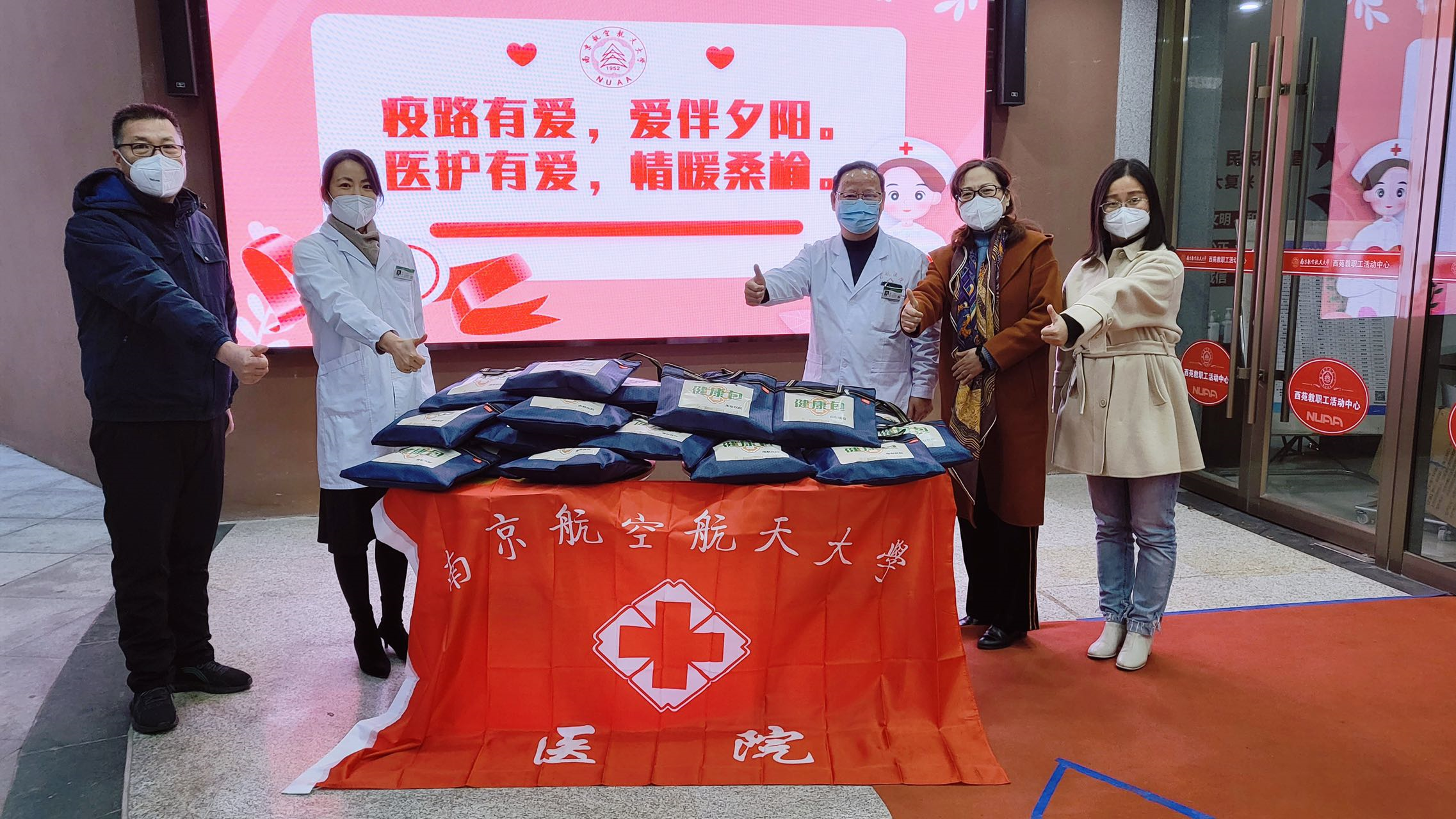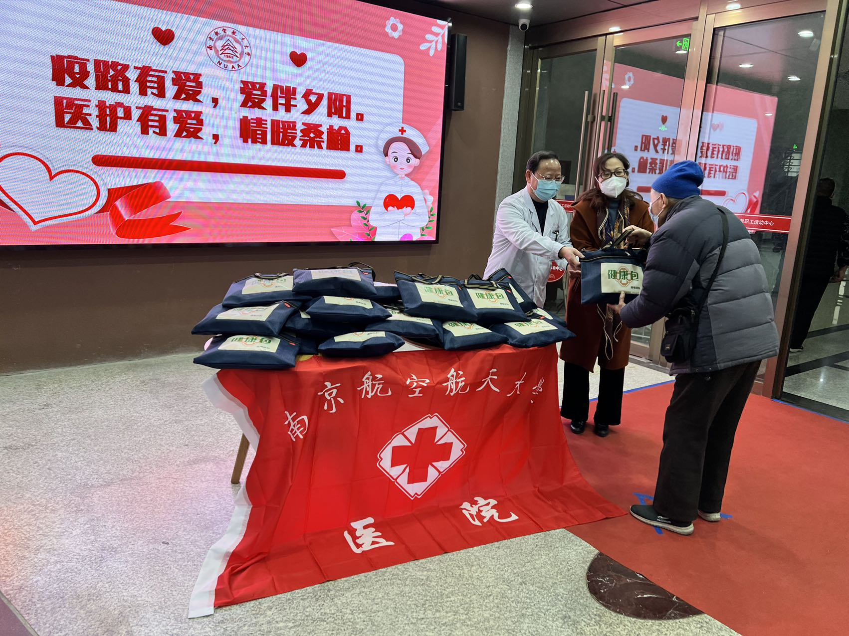 疫情无情,人有情,抗疫路上有爱心。为进一步做好对学校高龄空巢老人的关心、关爱工作,帮助他们一起共同战胜疫情,12月20日下午,校医院联合离退休处在西苑教职工活动中心共同开展了以“疫路有爱,爱伴夕阳;医护有爱,情暖桑榆”为主题的关爱高龄“空巢老人”活动,为学校80岁以上“空巢老人”送上了抗疫健康包。