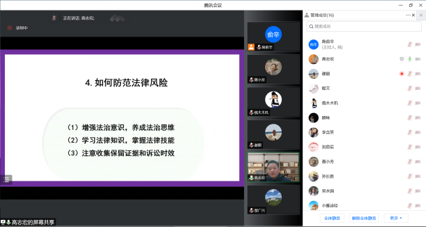 会上,院长高志宏以“全面依法治国与法律风险防范”为主题进行领学。他结合自身工作与实践经验分享了学习党的二十大报告的心得,解读了全面依法治国的重要内容,分析了法治工作指导方针的重大变化及其重要意义。同时,他结合实际案例,从法律风险防范的角度阐述了法律风险的内涵定义、发展趋势以及大学生法律事务的主要类型、防范措施。