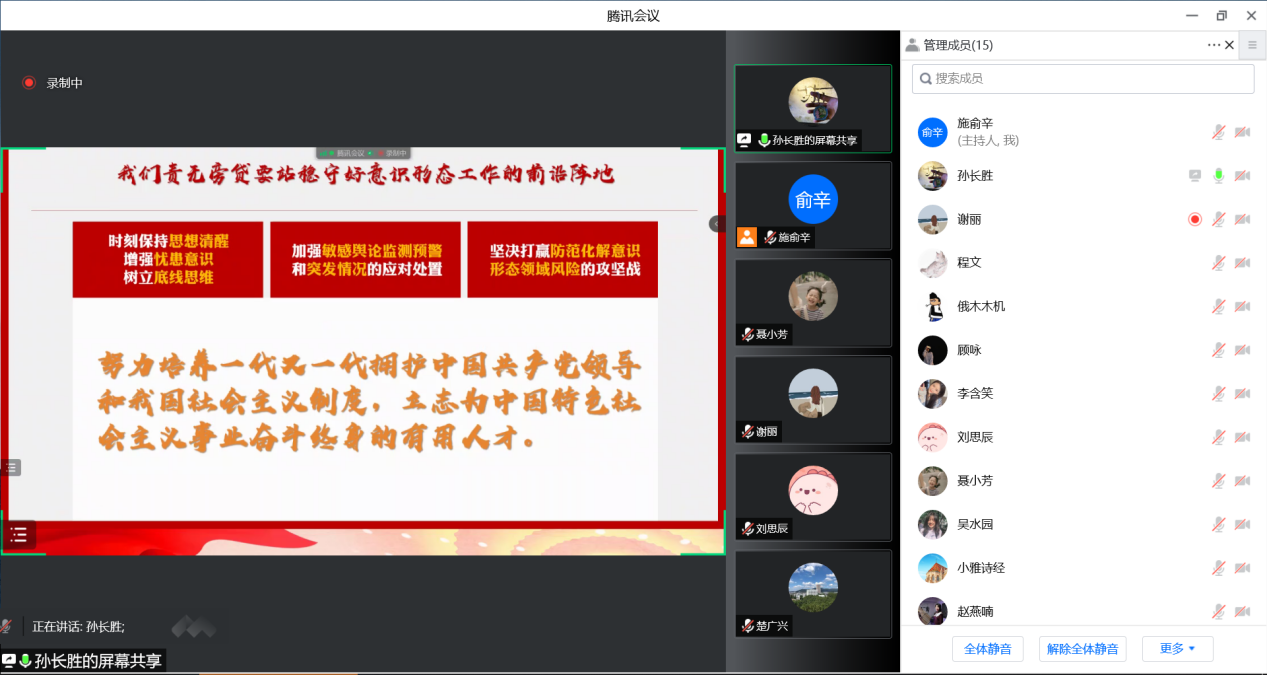 在重点发言环节,院党委青年委员、副院长茅晓嵩结合党的二十大精神,从学理角度阐释了什么是意识形态,并结合实际案例分析了在新的时代背下,应该如何开展好意识形态工作。同时,作为青年学生应该如何在意识形态领域坚持正确的方向,守好底线红线。学生党总支副书记、本科生党支部书记孙长胜从“全体党员要‘高站位’”“思政工作要‘落到位’”“主流舆论要‘不失位’” “关键时刻要‘不缺位’”四个方面阐述了如何处理好高校学生的意识形态问题,提出“辅导员要当好高校意识形态工作的‘排头兵’”,守好意识形态工作的前沿阵地。
