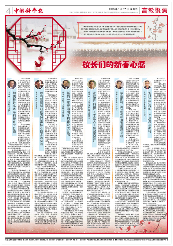 编者按:《中国科学报》年终特别策划“校长们的新春心愿”邀请北京理工大学、香港中文大学、南京航空航天大学等六所高校校长畅谈2023年的愿景和规划。现转发文章如下: