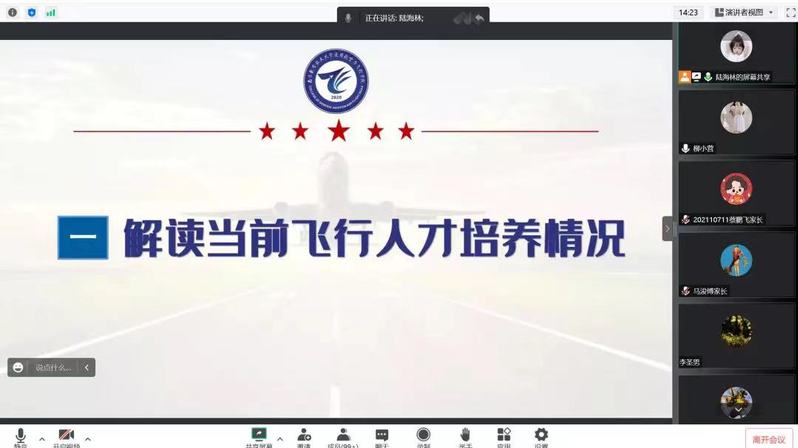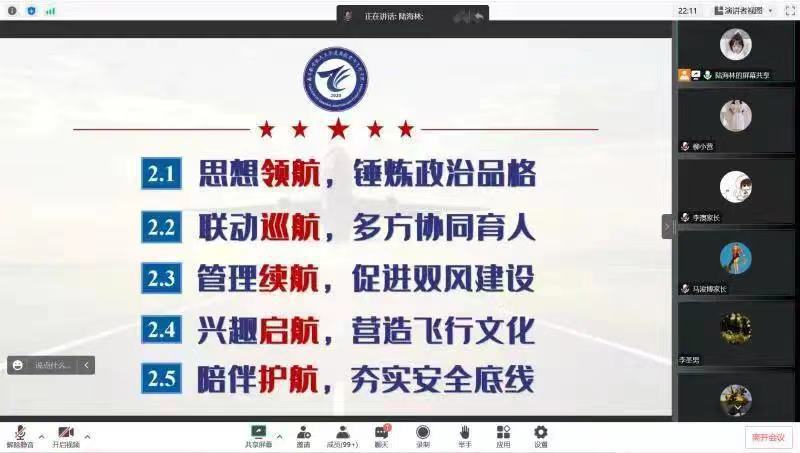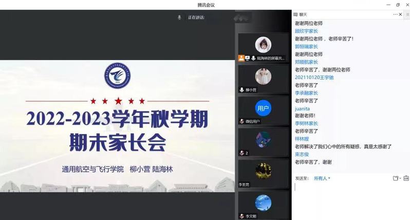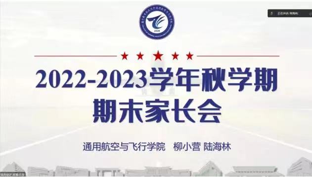 为进一步完善家校联动机制,充分发挥协同育人作用,凝聚家校合力,共促学生成长成才,1月16日,通用航空与飞行学院面向2021级飞行技术专业本科生召开2022-2023学年秋学期期末线上家长会,覆盖全体学生家长。辅导员柳小营和陆海林参加会议。