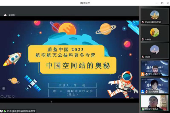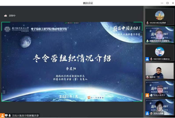 2023年1月14日晚,电子信息工程学院/集成电路学院联合南航北京校友会校友之家、科普与教育分会(筹)共同开展的“蔚蓝中国2023”航空航天公益科普冬令营正式开营。南航北京校友会副会长、中国北斗三号卫星系统总设计师陈忠贵,嫦娥四号、天问一号探测器系统总设计师孙泽洲,航天五院中国空间站机械臂设计师朱超,南航北京校友会副秘书长、校友之家负责人潘娜,南航北京校友会副秘书长、科普与教育分会(筹)负责人李晨阳,南航电子信息工程学院/集成电路学院团委书记席维唯出席活动并分别致辞。南航师生代表、校友及其子女,以及来自江苏、河南、贵州、江西等地学生约180人参加活动。