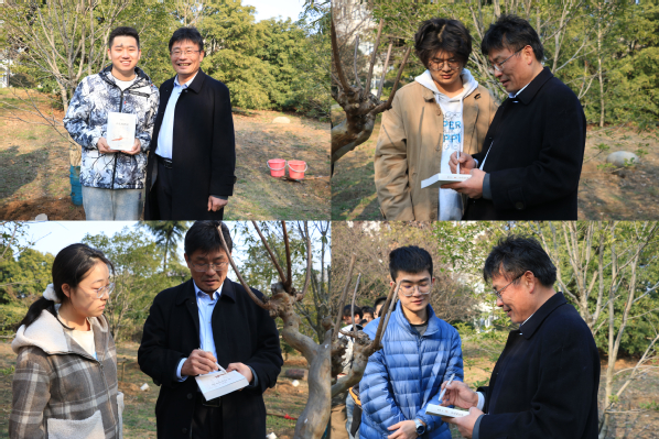 下午4时许,朱广生院士来到现场,亲切与在场师生交流,关心询问师生的学习、工作、生活情况。随后,在大家陪同下,朱院士植下一棵桂花树,用实际行动绿化美丽校园,用亲身经历向莘莘学子讲授科学故事,传承科学家精神。