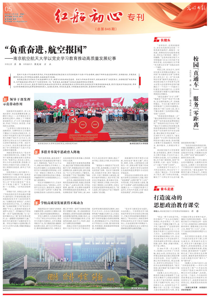 创新方式方法,活化内涵提升实效。通过专题党课、专家报告、红色基地教育、党内主题教育活动等丰富多样的组织形式,实现党员干部教育培训全覆盖。通过校地联学共建、师生支部贯通研讨、党课赛课竞赛、比赛学习笔记等百花齐放的学习方式,推动理论学习入脑入心。通过大力营造浓厚学习氛围,运用媒体传播效应,不断扩大学习教育的渗透力和影响力。众多主流媒体对学校开展各类学习教育进行集中报道,其中《光明日报》整版报道我校深入开展党史学习教育,重点突出、亮点频出的特色活动,成为南航创新学习教育的闪亮名片。