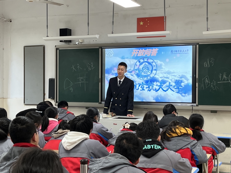 在交流互动环节,顾丁一耐心回答了学弟学妹们有关高中学习经验、民航招飞、南航历年录取情况等问题的提问。他还引用南航首届学生在开学典礼上喊出的“昨天为祖国战斗,今天为祖国学习”口号,勉励学弟学妹们“今天为祖国学习,明天为祖国战斗”。