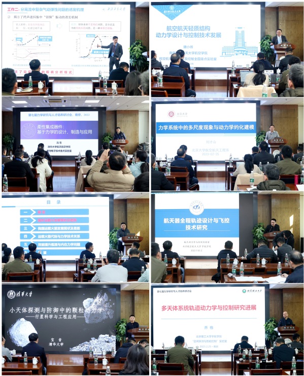 会议邀请了8位国家杰出青年基金获得者等国家高层次人才等作大会报告。清华大学航天航空学院冯雪教授作“柔性集成器件:基于力学的设计、制造与应用”的报告,南京航空航天大学航空学院院长魏小辉教授作“航空航天轻质结构动力学设计与控制技术”的报告,北京大学航空航天工程系主任刘才山教授作“力学系统中的多尺度现象与动力学约化建模”的报告,清华大学宝音贺西教授作“小天体探测与防御中的颗粒动力学”的报告,上海宇航系统工程研究所研究员、运载领域总研究师盛英华作“运载火箭发展与力学需求研究”的报告,北京理工大学宇航学院副院长乔栋教授作“多天体系统轨道动力学与控制研究及在深空探测中的应用”的报告,北京航空航天大学徐明教授作“航天器全程轨迹设计与飞控技术研究”的报告,西北工业大学航空学院张伟伟教授作“从气动弹性力学到智能空气动力学——浅谈青年学者学术方向的选择”的报告。