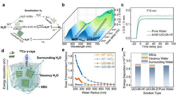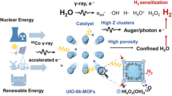 图1. 以UiO-66为代表的纳米级MOFs可用高效电离辐射分解水制备绿氢