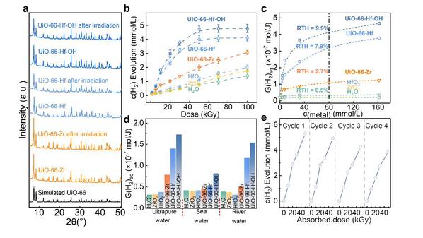 研究团队通过成熟水热法合成了多种UiO-66材料并用于辐射析氢测试,结果表明,金属中心的原子序数、官能化配体均与其辐射稳定性与析氢性能密切相关,其特殊的孔道结构既有助于二次电子的碰撞与能量传递,也有助于水分子的激发与电子吸附解离过程,析氢性能超过常规的金属纳米氧化物10倍以上。此外,由于辐射分解与传统光、电法在能量沉积、激发方式、反应路径截然不同,辐射催化析氢的优势在于适用于各类自然水体,避免了耗能的纯化过程。研究团队采用未处理的长江水、海水进行了比较测试,发现其析氢效果与实验室纯水几乎相同,证明该催化剂具有优良的抗污染性能,具有广阔的应用前景。同时,该UiO-66基催化剂在进行长时间辐射产氢测试后,依然保持较高的稳定性和循环性,例如,在经历了四次高剂量200 kGy的辐照后,UiO-66-Hf-OH依然可保持74%的催化产氢效率。