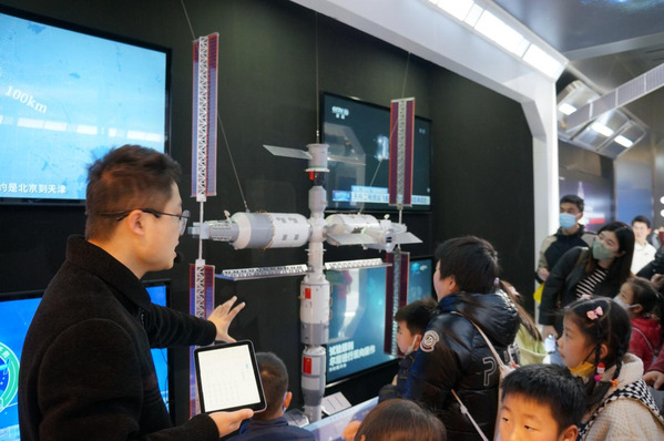 在航天学院博士生许传晓带领下,参观了航天教育教学基地,近距离了解火箭、卫星、空间站、火星探测,从认识航天器到学习航天史,“沉浸式”感受国家航天事业的发展,感悟航天精神。