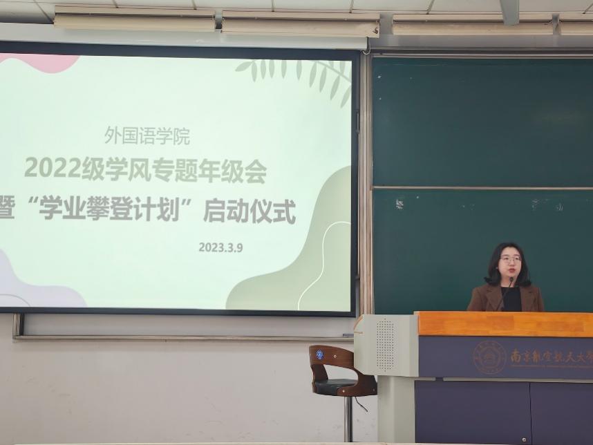 3月9日,外国语学院2022级本科生学风专题年级会暨“学业攀登计划”启动仪式在D1116顺利召开。此次年级会旨在提高同学们学习的积极性和主动性,营造良好的学习氛围。大会由2022级本科生辅导员曹文清主持召开,外国语学院2022级全体本科生参加。