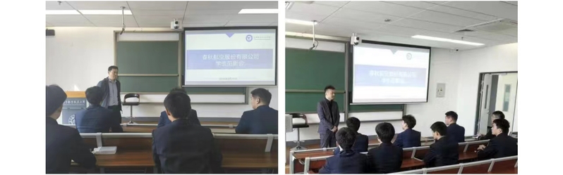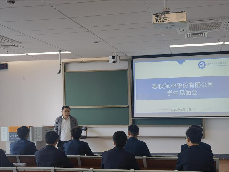 3月10日,春秋航空股份有限公司航司见面会暨行业思政课在天目湖校区巡天楼515教室举行。春秋航空股份有限公司副总裁沈巍、总飞行师兼飞行部总经理杨刚、飞行学员队经理柴宏伟出席会议。全体春秋航空在校飞行学员参加会议。