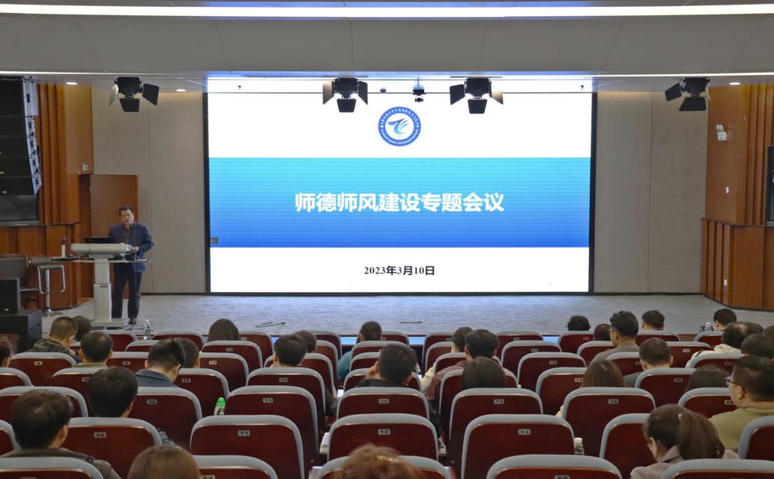 王勤指出,学院始终以党的二十大精神和学校第十七次党代会中关于师德师风建设的重要论述作为指引,将完善教师思政教育和健全师德师风评价体系作为指导工作。他表示,教师是培养高素质、高层次、多样化、创新型人才的核心群体,师德师风建设是当前教师队伍建设的首要任务。他强调,教职工需提高政治站位,守好本职工作,严格落实上级部门颁布的相关规定,不断加强师德师风学习。领导干部要以身施教,自觉躬行师德师风与行为准则,做好带头作用。专任教师在教学过程应把专业教学内容与思政教育元素融合起来,将德育与智育相结合。同时需要注意自身的仪容仪表,言传身教、谨言慎行,抓好每一处细节为学生树立榜样。辅导员要切实做到以生为本,从学生具体情况出发,增强思想政治教育的说服力,帮助学生全面发展。管理人员要加强服务意识,提升职业道德修养。注重工作的规范性,提高制度的执行力与快速反应能力。