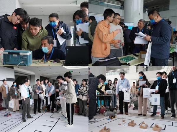 决赛现场,参赛队伍在一号楼大厅做作品展示。本场决赛邀请了解放军陆军工程大学潘克修教授等6位校外专家和10位校内专家组成评委团。决赛现场,评委们从作品完成度、技术指标、创新性等多个角度对各参赛作品进行评审,并与同学们深入交流,指导他们提升专业能力。