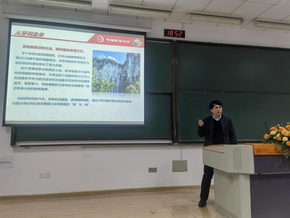 王新明以“为航空发动机加油”为主题,以思政课和招聘宣讲相结合的形式,为能动学子带来了一场别开生面、启示深远的“开学第一课”。他以红林公司的发展历程为主线,讲述了红林人投身航空发动机事业的奋斗史,老一辈“三线”科研工作者“艰苦奋斗、红心爱党”的崇高情怀和以建设祖国国防事业为终生追求的拳拳报国之心。他欢迎能动学子加入中国航发红林,以航空报国为己任,传承红色基因、赓续精神血脉、共担历史使命。