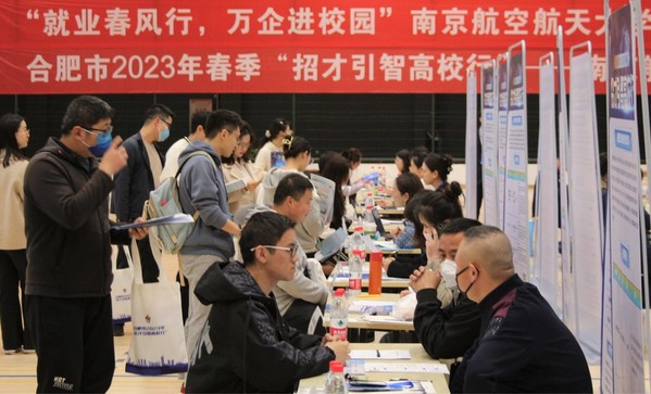 下午,合肥市组团招聘会同步在将军路校区体育中心举行,中国电子科技集团公司第八研究所、长鑫存储技术有限公司等38家用人单位参会,为毕业生提供涵盖不同学历层次、专业的千余个就业岗位,覆盖我校全部学科专业,现场吸引了200余名毕业生到场参加。会后,吴文利、王霄一行前往招聘现场,与参会单位代表、学生交流。