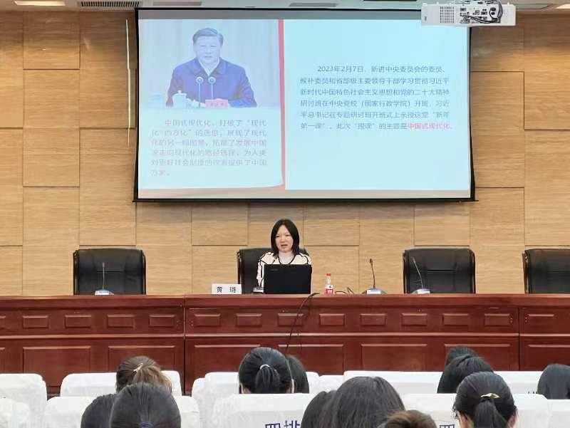 3月10日,外国语学院联合人文与社会科学学院、艺术学院在外院国际会议中心开展 “青马工程”第三讲——《以中国式现代化全面推进中华民族伟大复兴》,来自马克思主义学院的青年优秀教师黄璐为三个学院“青马工程”培训班的学员们带来了一堂精彩的授课。