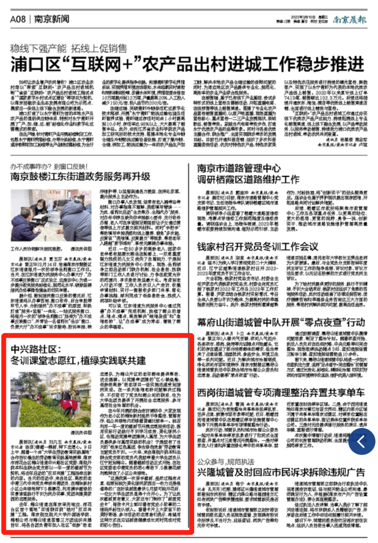 近日,《南京晨报》报道了外国语学院联合雨花台区梅山街道中兴路社区开展“传承红色基因,争当绿色使者”劳动教育主题冬训活动。本次活动利用一年一度的植树节开展志愿服务,有效推动党建带团建深入基层,为大学生党员、团员提供参与基层实践的机会。学院团委书记李萍、本科生联合党支部书记彭欢、学生党员代表团员代表及中兴路社区党员代表参与了本次活动。